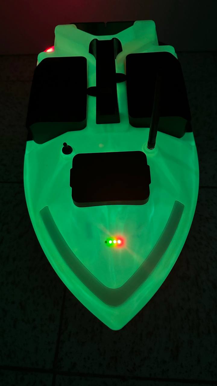 Лодка за захранка V020 с GPS система за 40 точки, обхват до 500 м и капацитет от 2 кг. Подходяща за нощен риболов с LED осветление.