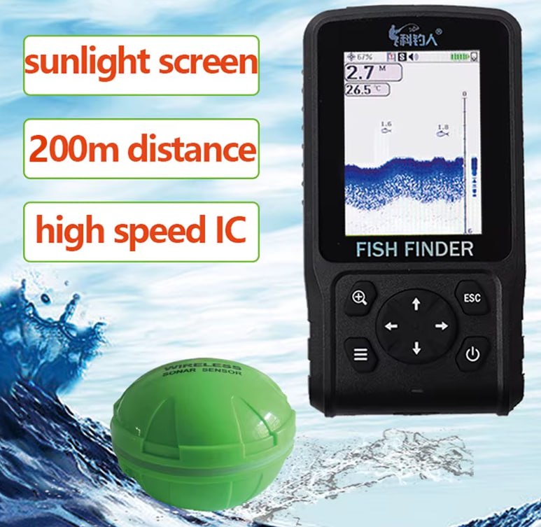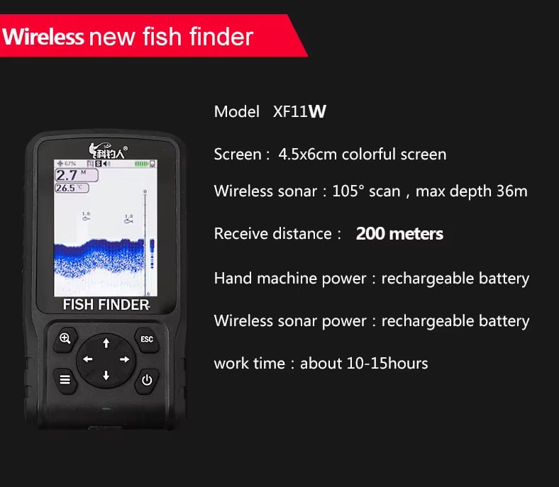 Безжичен риболовен сонар XF11W с обхват до 200 м, цветен LCD дисплей и работно време до 15 часа. Идеален за риболов на дълбочина до 45 м
